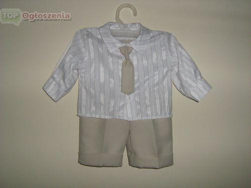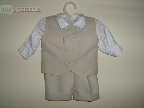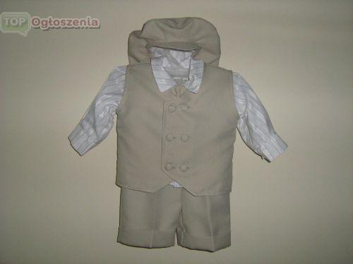 Sprzedam NOWY, elegancki strój dla chłopca do chrztu albo na inną uroczystość. Komplet w rozmiarze „62” składa się z pięciu części: spodnie, koszula, krawat, kamizelka oraz czapeczka.